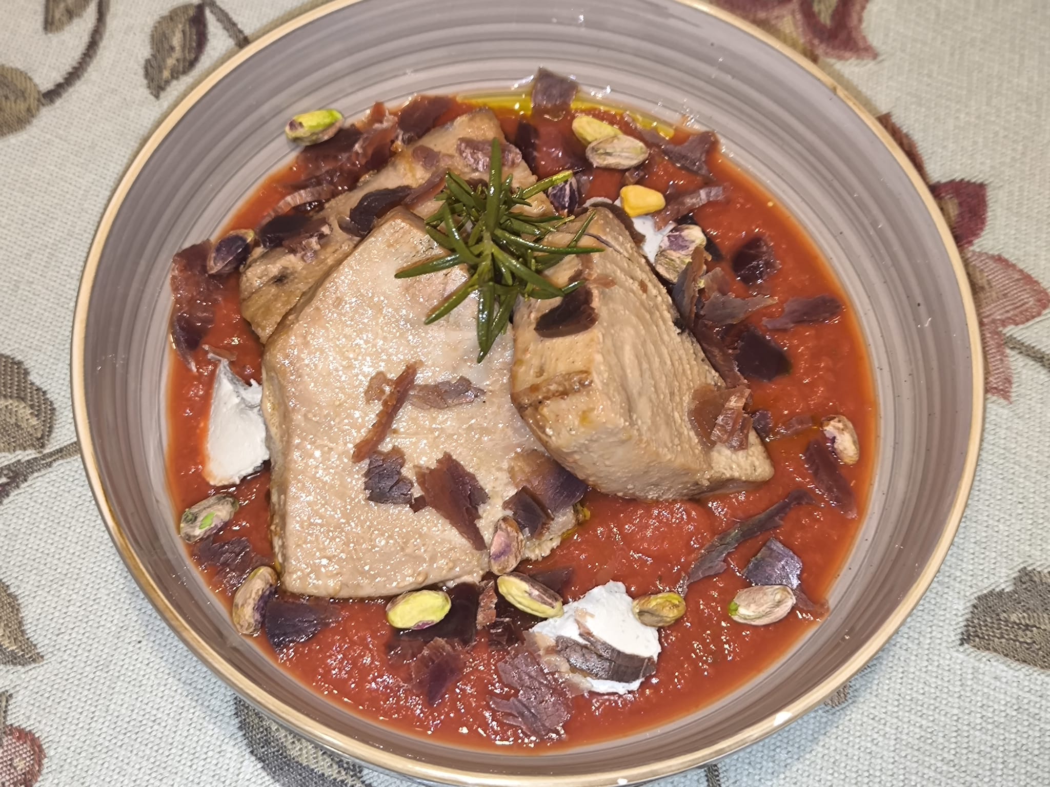 Atún confitado sobre base de tomate especiado