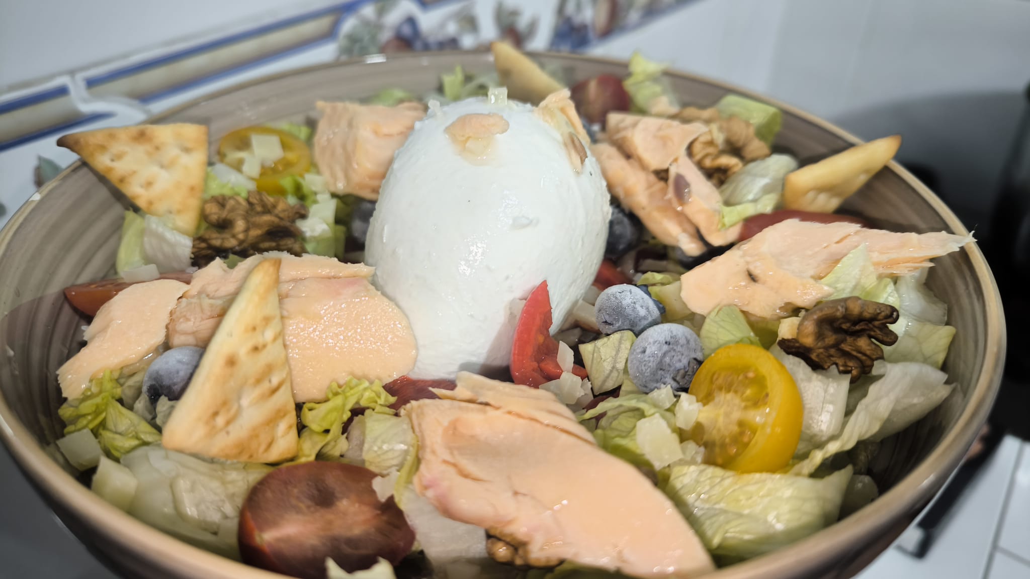 Sirve inmediatamente para que el mezclum esté crujiente y los sabores exploten. Cada bocado es una aventura: primero la fresa dulce, luego la cremosidad de la mozzarella, el salmón jugoso, el crunch de la nuez, el puntito ácido del vinagre y el queso que lo ata todo… ¡es una sinfonía en la boca!